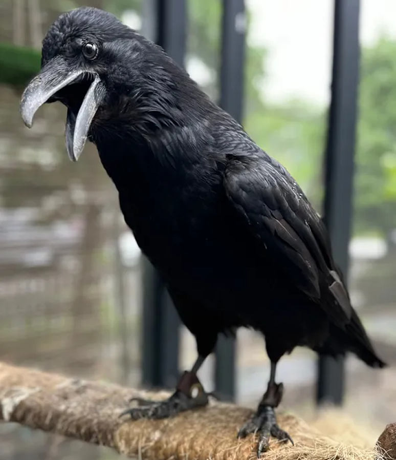 Hatched in 2023, Zola is a common raven that arrived to us with clear indications that someone had attempted to keep her as a pet, and after being unable to care for her, set her loose. Every attempt was made to re-wild her, including pairing her with our other raven in care, but it became clear that she had already become habituated to humans in her time before coming to Congress of the Birds.
