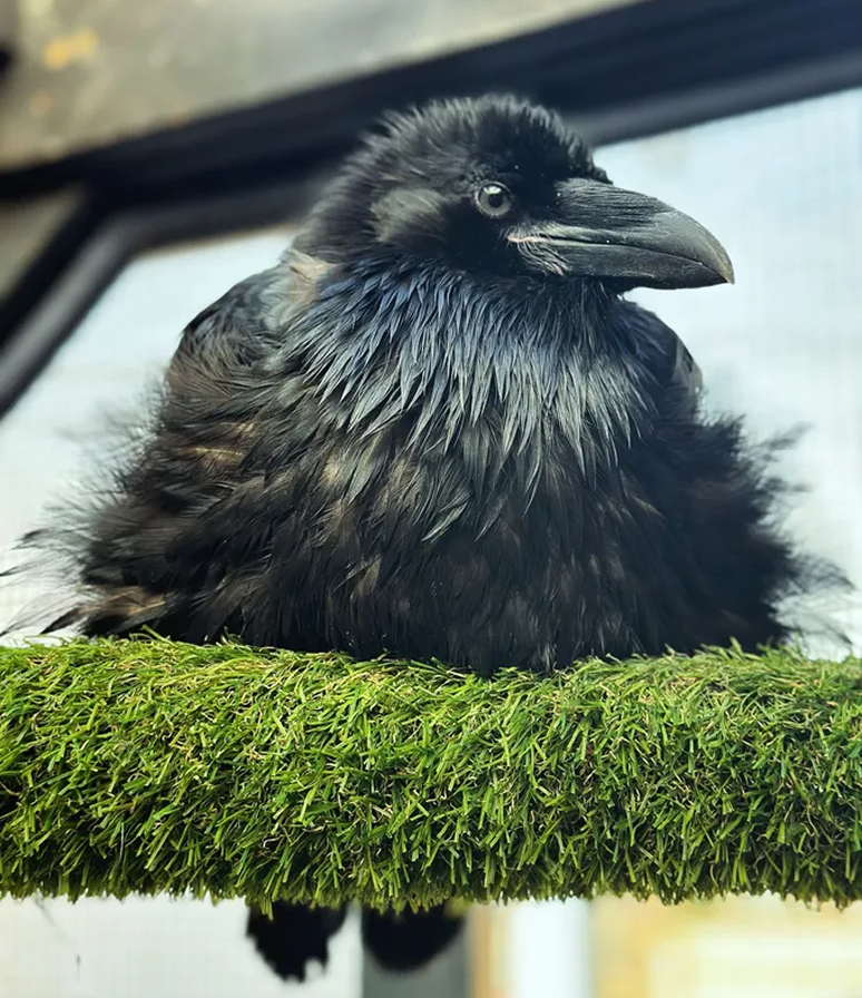 In June 2023, Zia walked right up to the individual that found him and into a carrier. We assume that Zia, a common raven, had been raised by a human who had then attempted to ‘release’ him without proper knowledge of how corvids imprint upon people. When he came into our care, he was severely emaciated, with various metabolic issues from poor nutrition. Zia received months in care, and unfortunately our multiple attempts to ‘re-wild’ him were unsuccessful.